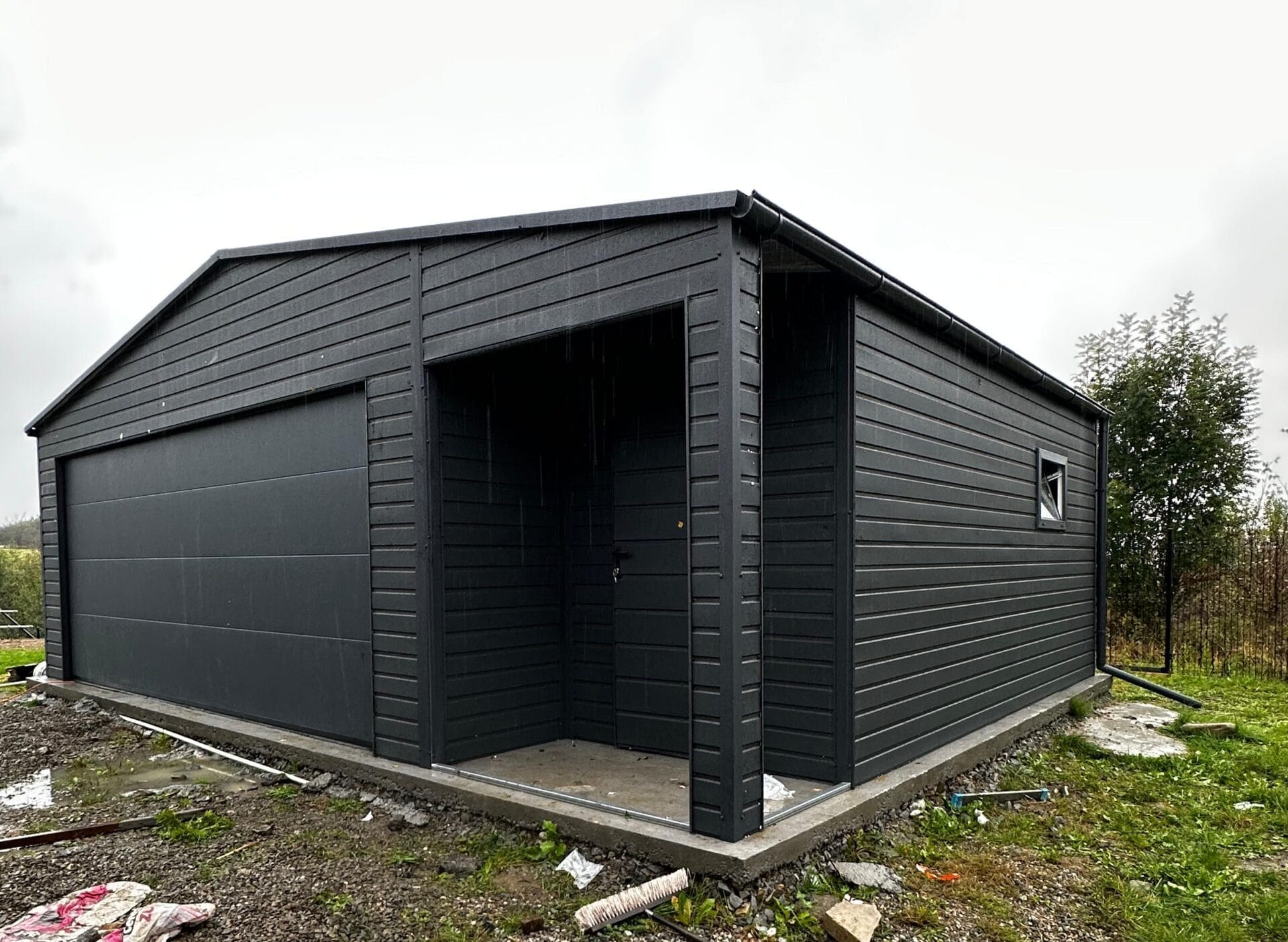 Specyfikacja: -całość konstrukcji zamknięty profil ocynkowany -brama segmentowa 5m x 2m z automatyką -drzwi serwisowe -okno PCV -dach pokryty blachą trapezowa z filcem antyskropleniowym -obróbki blacharskie Ceny wliczają montaż, transport oraz kotwiczenie na terenie całego kraju, garaż możesz skonfigurować dowolnie oraz rozszerzyć o dodatki: -automaty do bram uchylnych -konstrukcje pod ocieplenie – zapytaj doradcy -blachodachówkę -orynnowanie -dodatkowe otwory, drzwi lub okna
