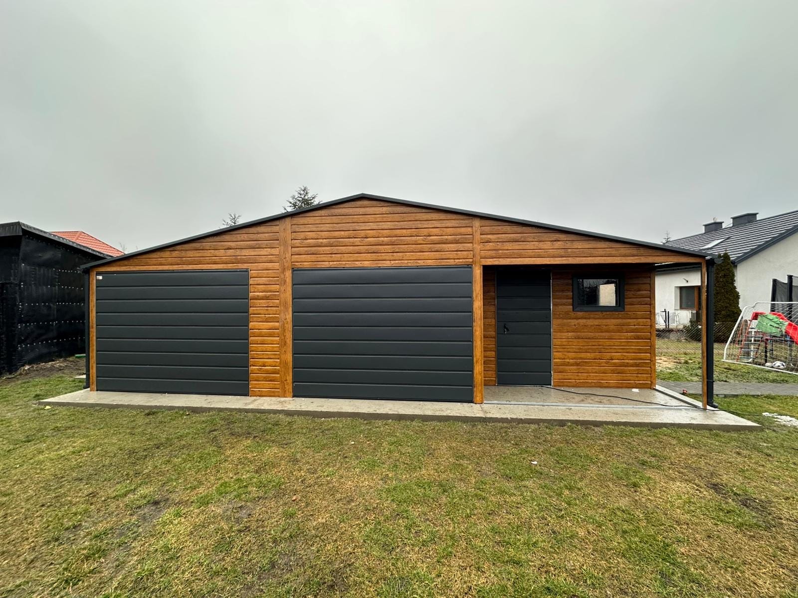 Specyfikacja: -całość konstrukcji zamknięty profil ocynkowany -2x brama uchylna (276 x 190) -drzwi serwisowe -okno PCV -dach pokryty blachą trapezowa z filcem antyskropleniowym -obróbki blacharskie
