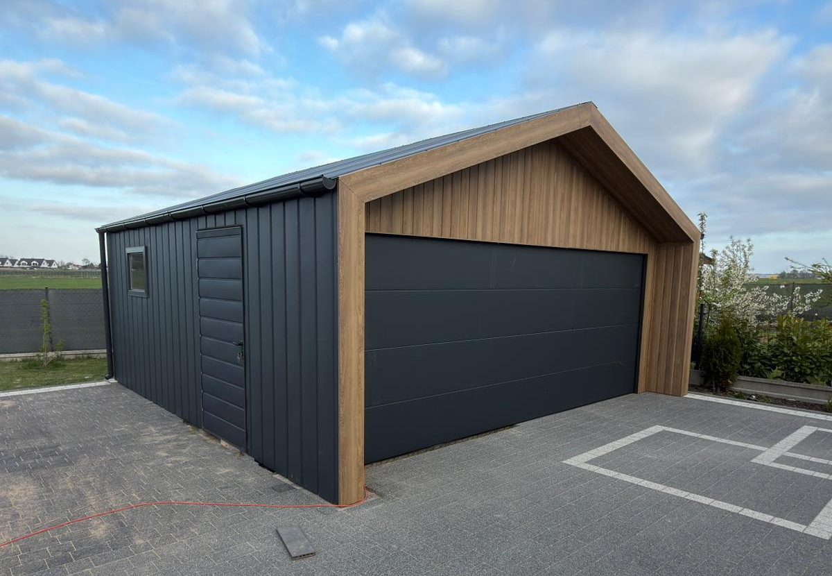 Połączenie grafitowej blachy RAL 7016 „Grafit MAT” z frontem Winchester tworzy elegancki i nowoczesny kontrast. Drewnopodobny front ociepla całość, a grafitowe ściany i dach podkreślają minimalistyczny charakter garażu.