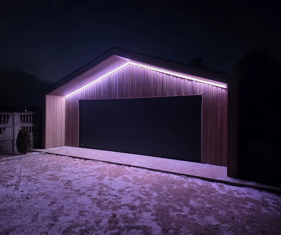 - Oświetlenie: LED na froncie garażu (pod wypustem dachu)
