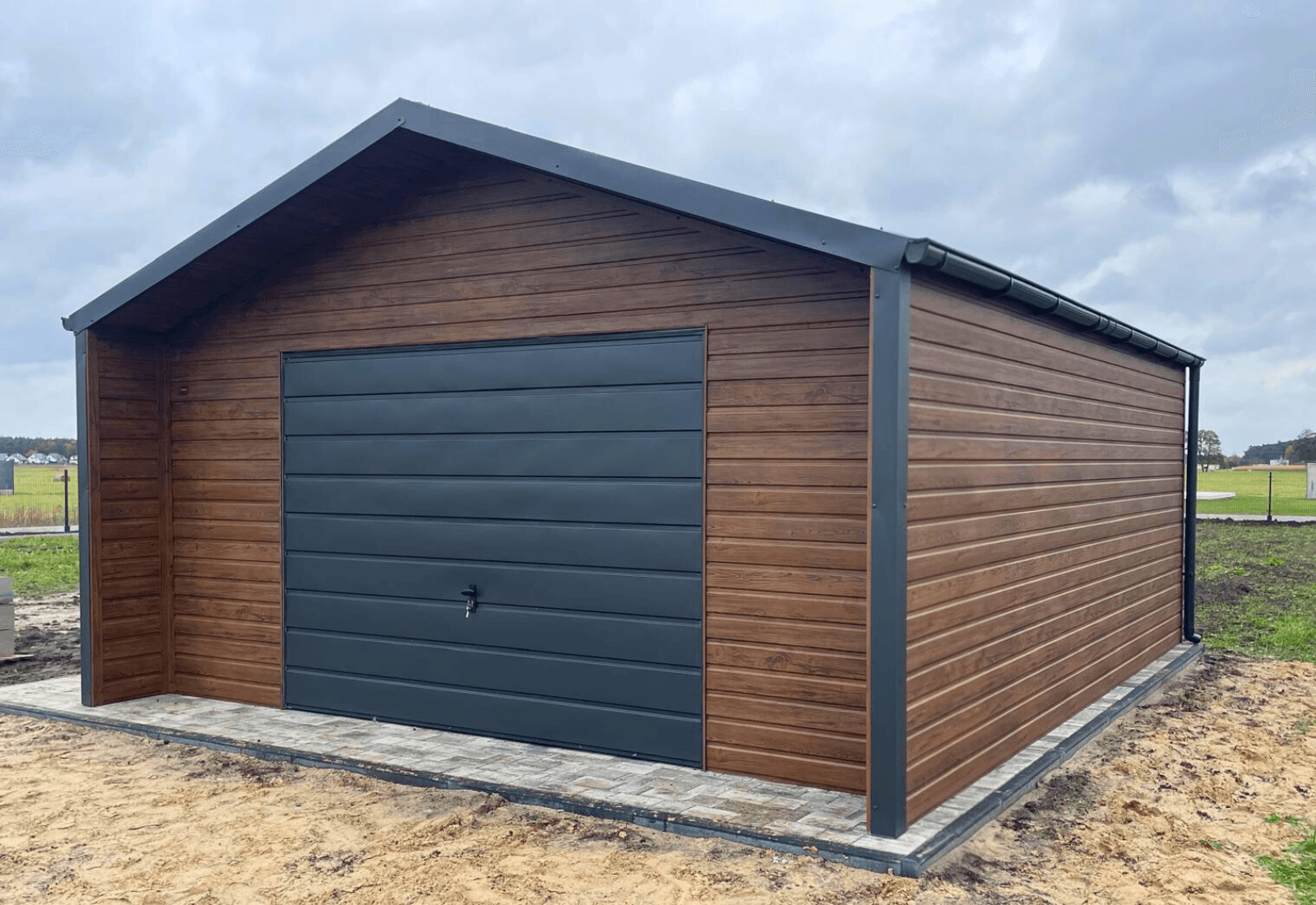 -ściany pokryte blachą trapezową w kolorze „Orzech”