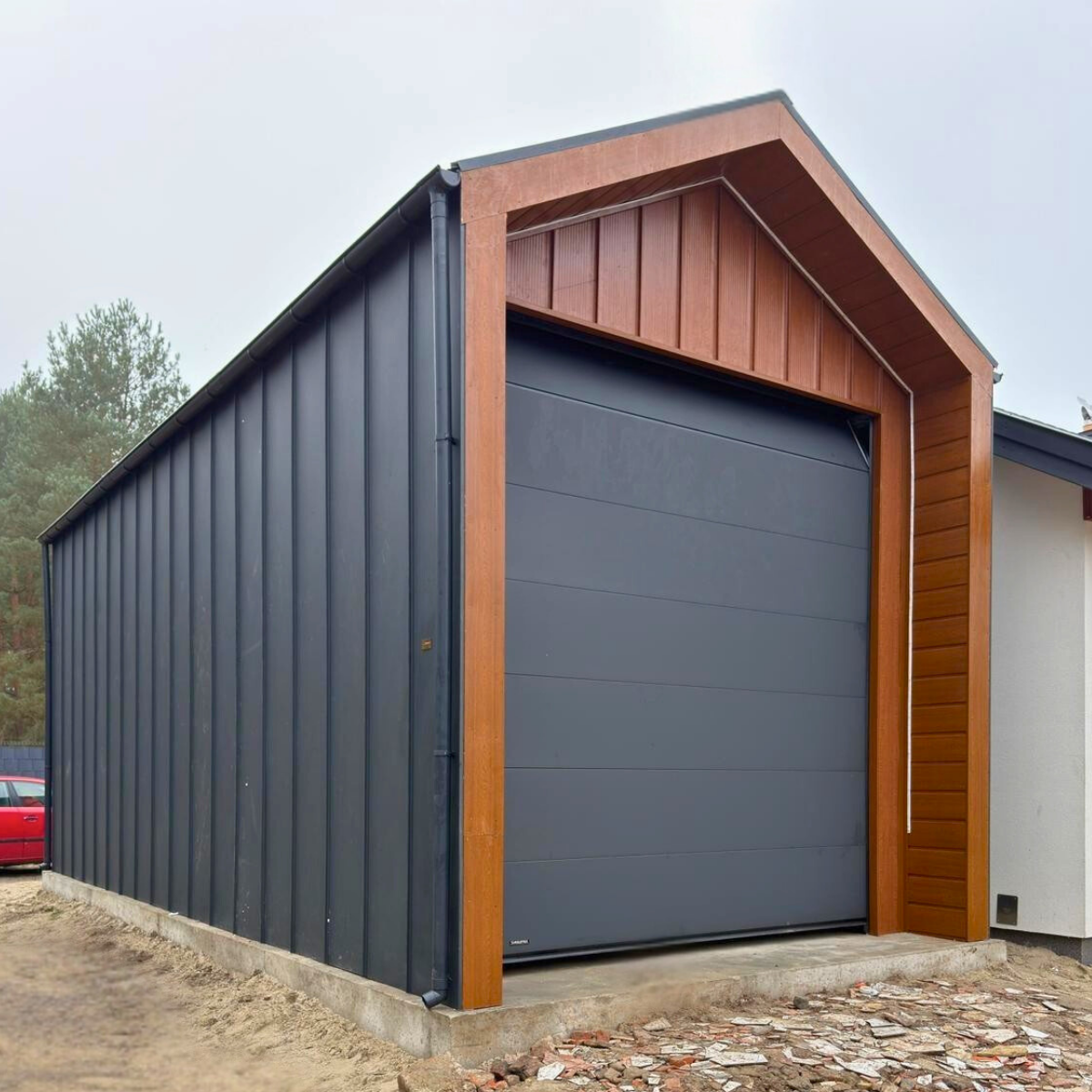Zastosowanie blachy na rąbek stojący z mikrofalą, kontrastowe połączenie grafitu z wykończeniem drewnopodobnym oraz szeroki wypust dachu nadają całości wyrazisty, elegancki charakter. Konstrukcja stalowa oparta na zamkniętych profilach ocynkowanych zapewnia trwałość, sztywność oraz możliwość dalszej rozbudowy lub ocieplenia.