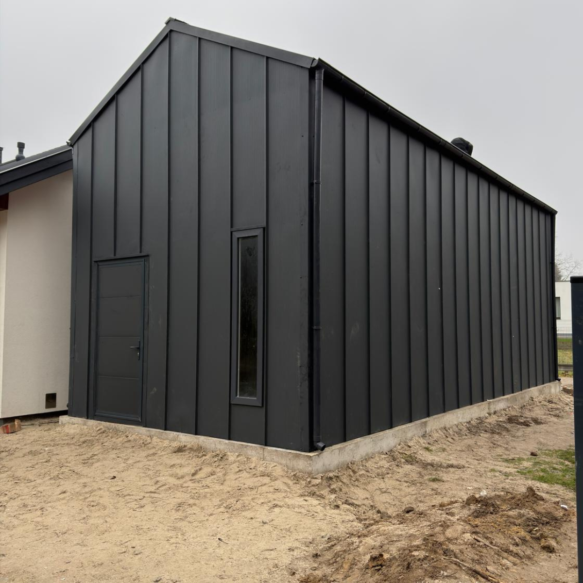 - Ściany: blacha na rąbek stojący, szerokość przetłoczenia 50 cm z mikrofalą, kolor RAL 7016 Grafit MAT