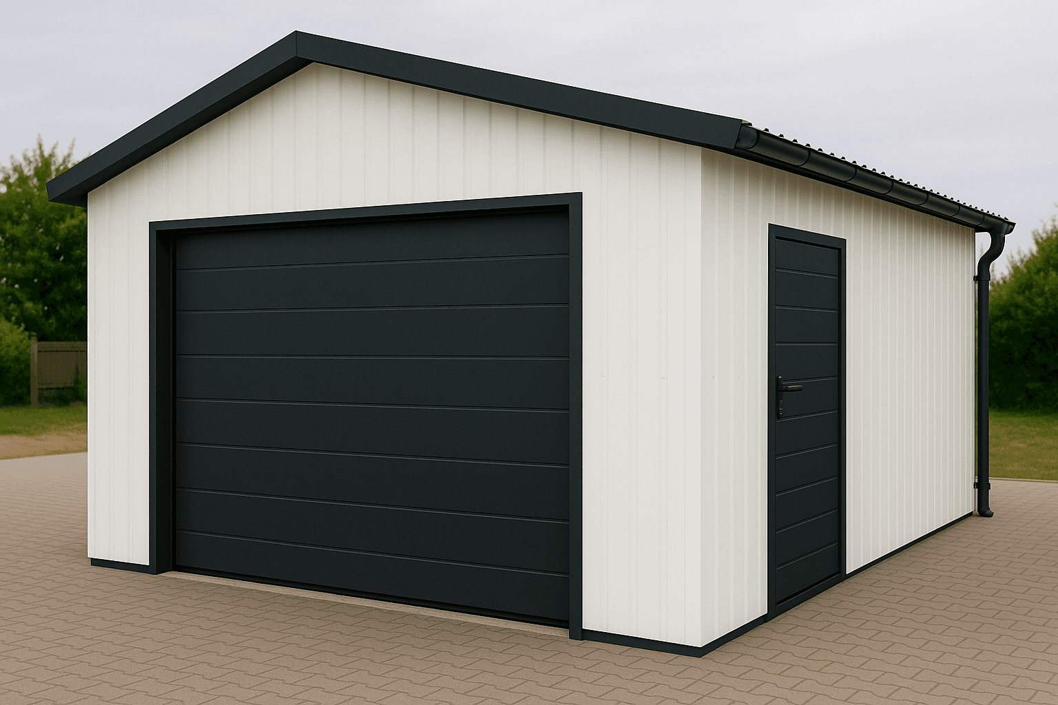 Nowoczesny garaż z płyty warstwowej o doskonałej izolacji termicznej. Solidna konstrukcja stalowa, estetyczne wykończenie i szybki montaż w cenie. Idealny jako garaż całoroczny, magazyn lub warsztat. Dostępne różne kolory i grubości płyt.
