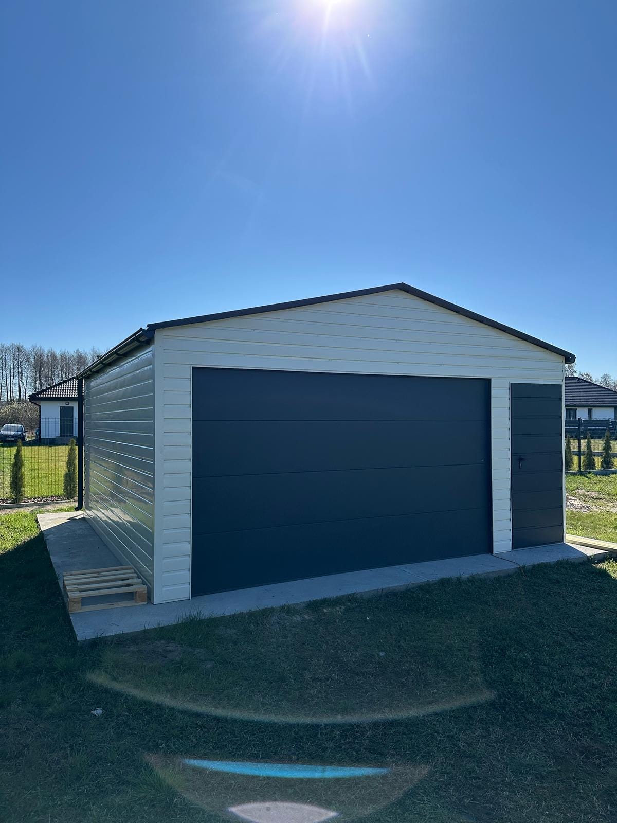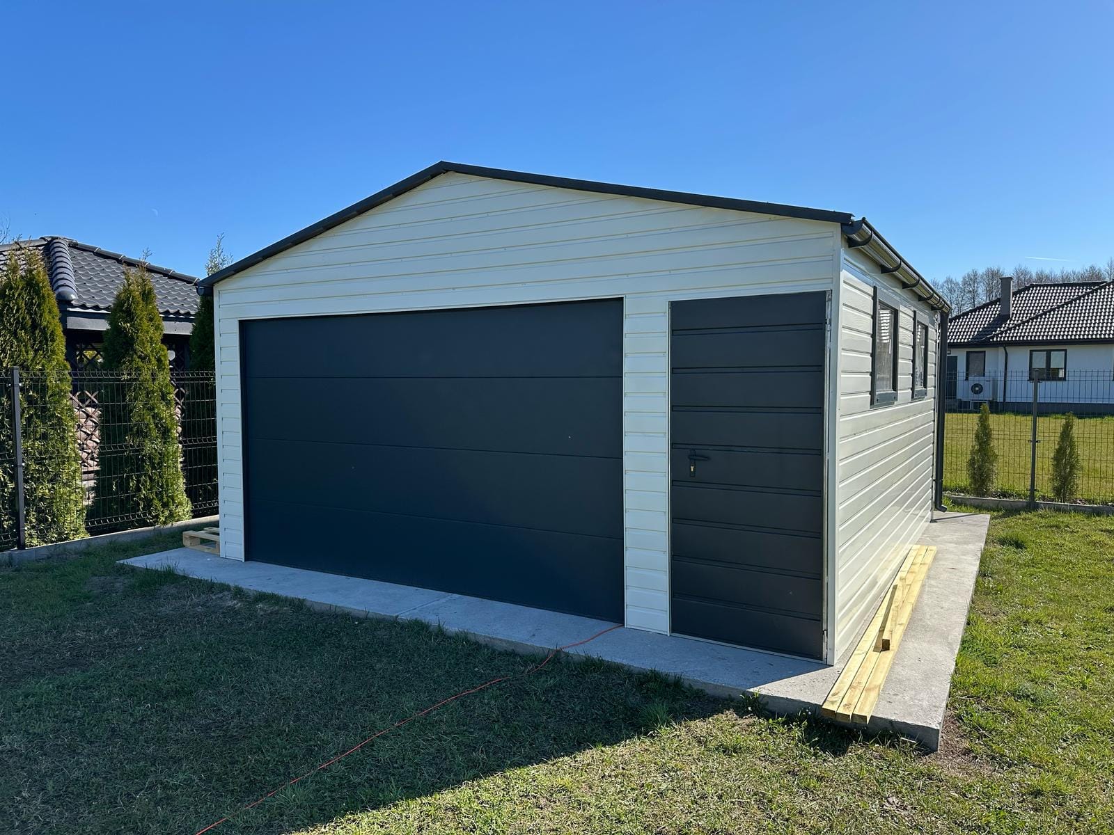 Garaż blaszany 5,5m x 5,5m(do 35m2) Bialy + Grafit, brama segmentowa
